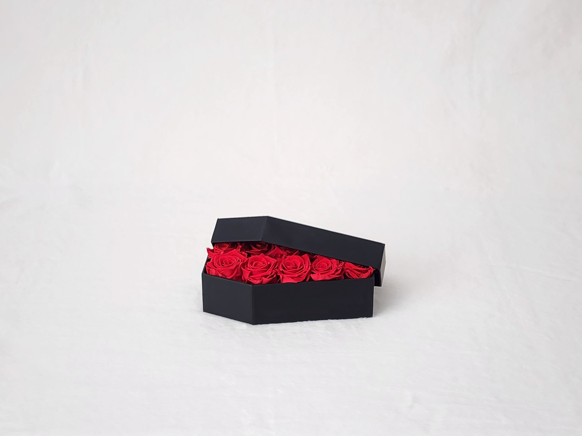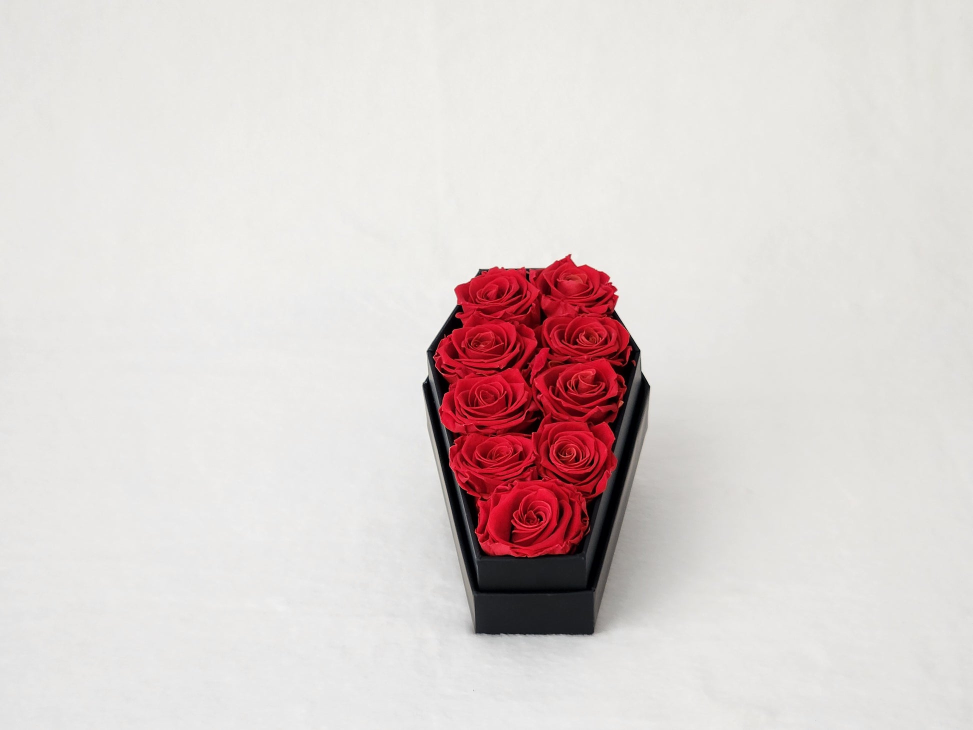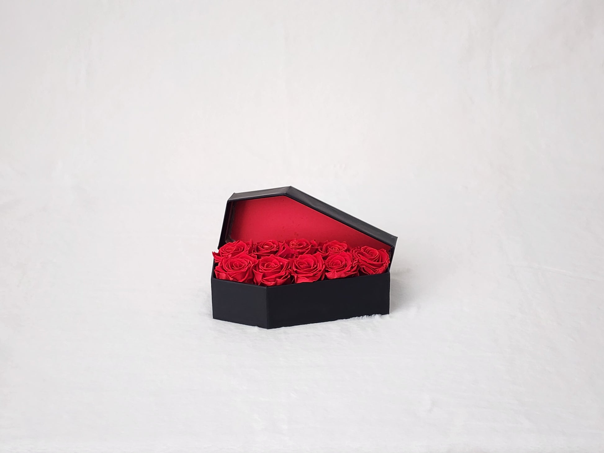 Deluxe Eternal Red Rose Coffin Red roses that never bleed. These blooms are locked in midnight forever—no water, no sun, just deep crimson. Black matte coffin, blood-red lining, Opens like a tomb. Closes like a secret. Handmade. Free U.S. shipping.