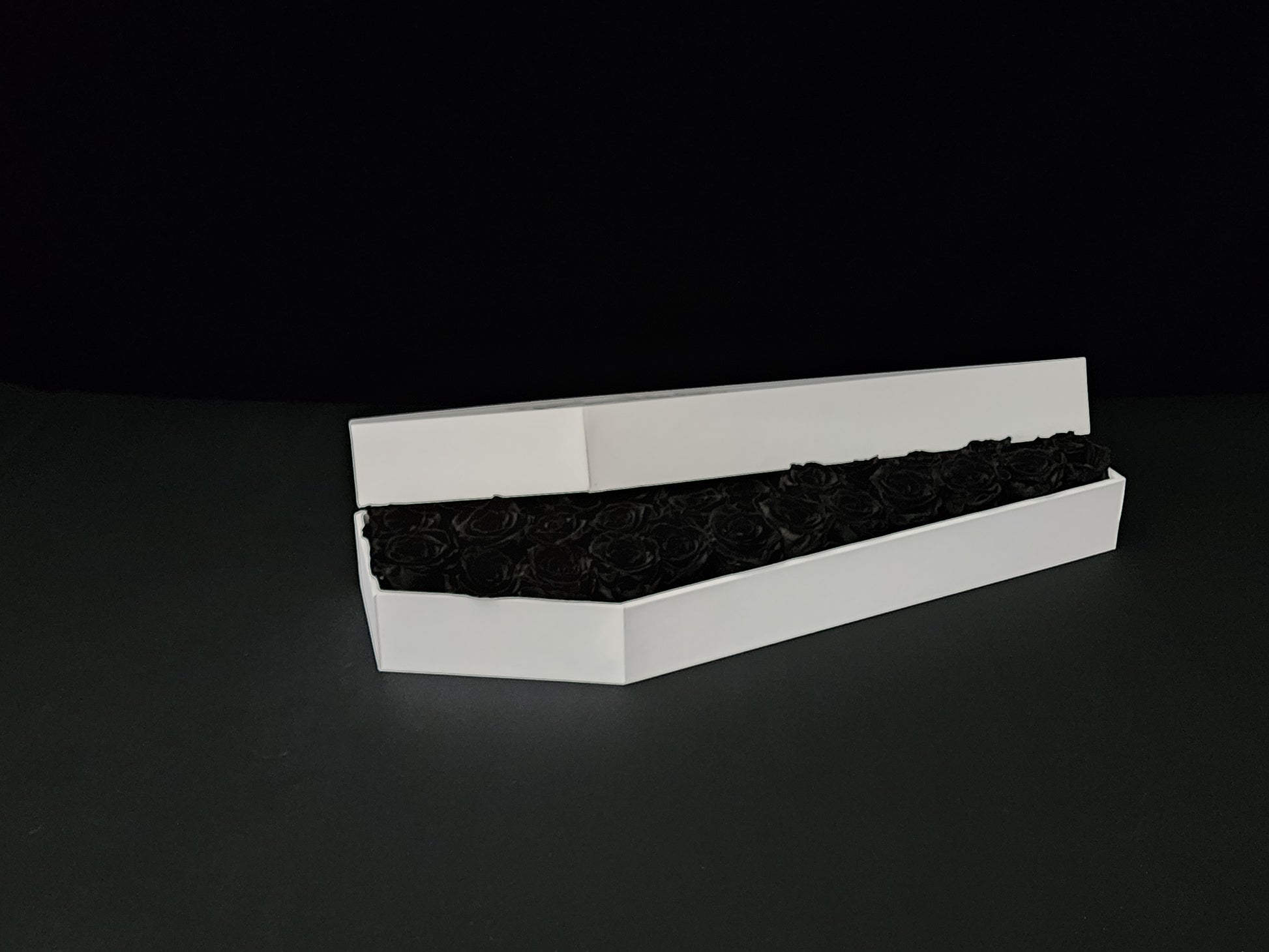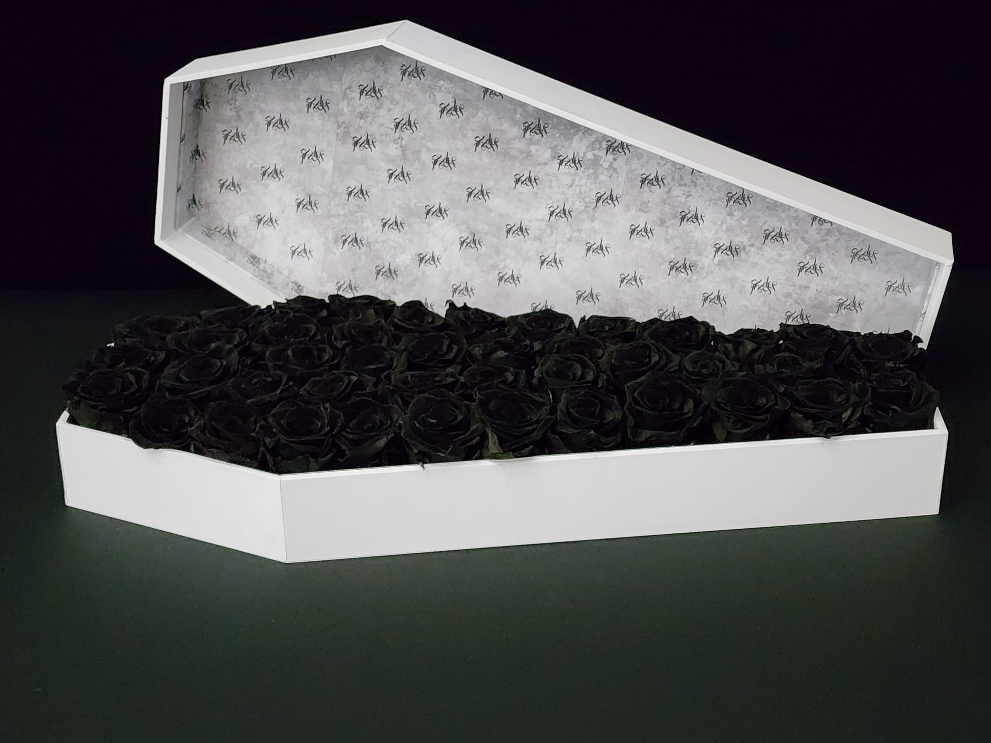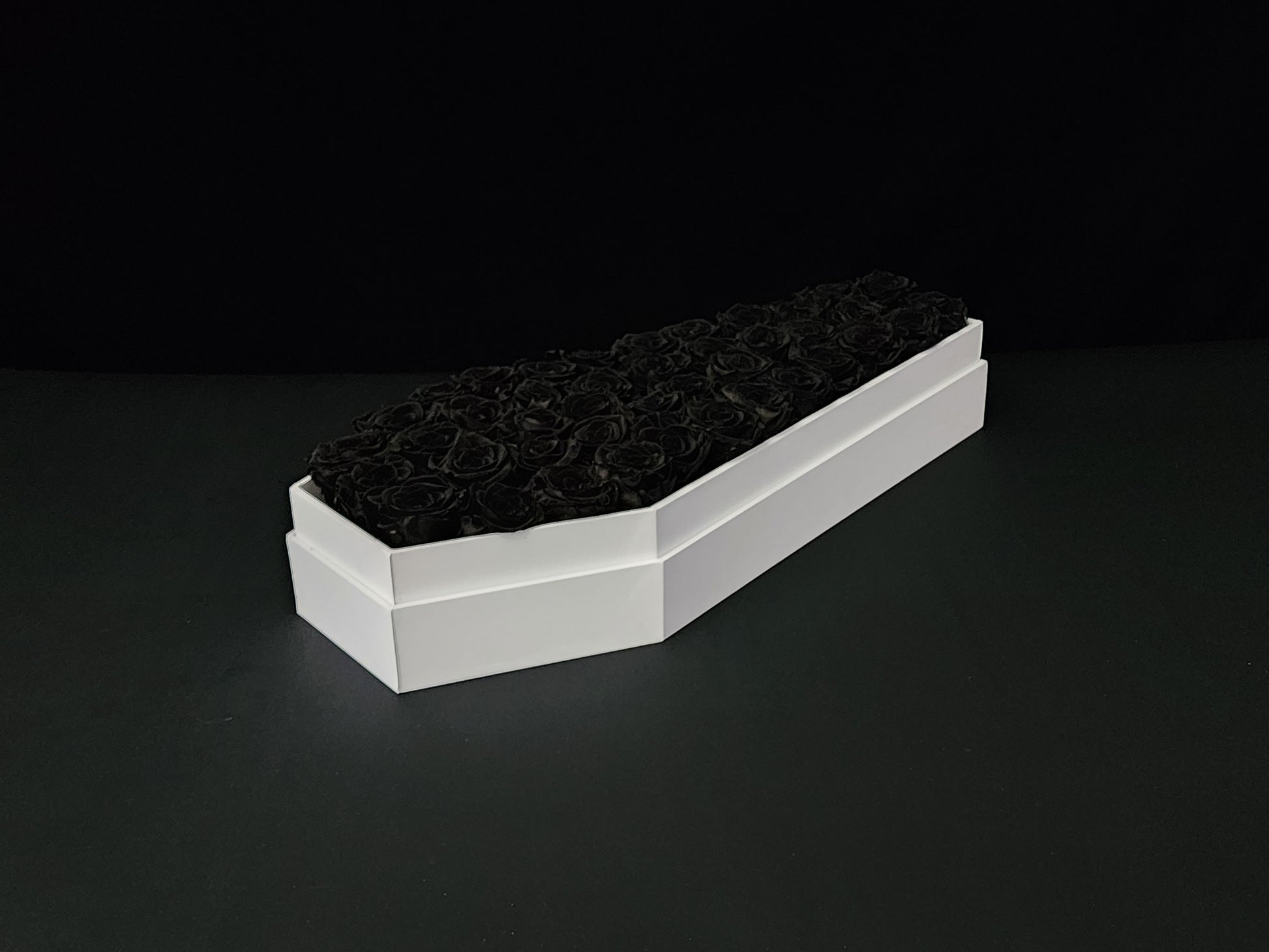 Romance in the shadows. The Phantom Marquee is a striking centerpiece of pure contrast. Meticulously handcrafted in the Ravens Roses Atelier, this massive 21-inch signature white coffin houses an abyss of real, preserved black roses.