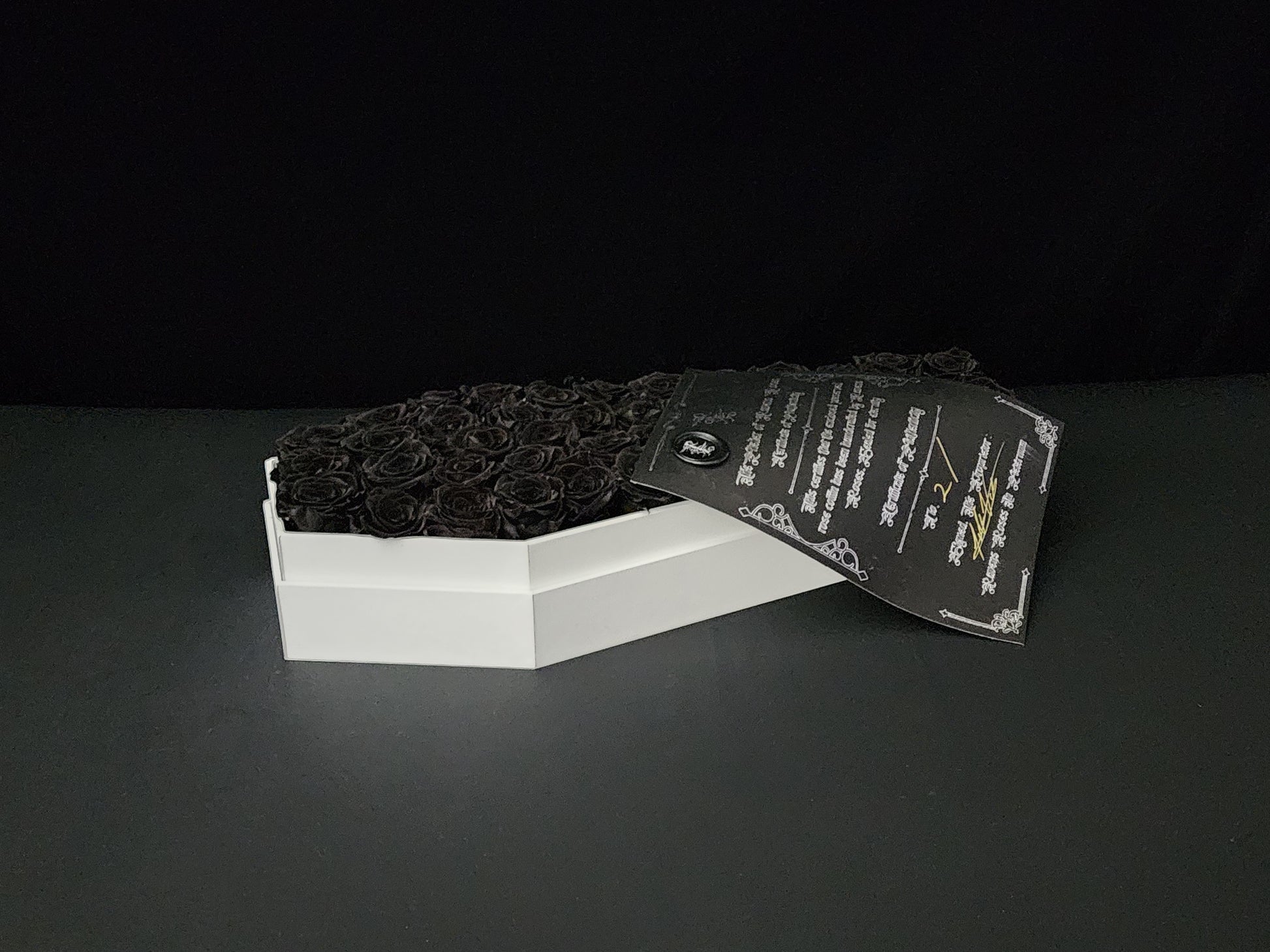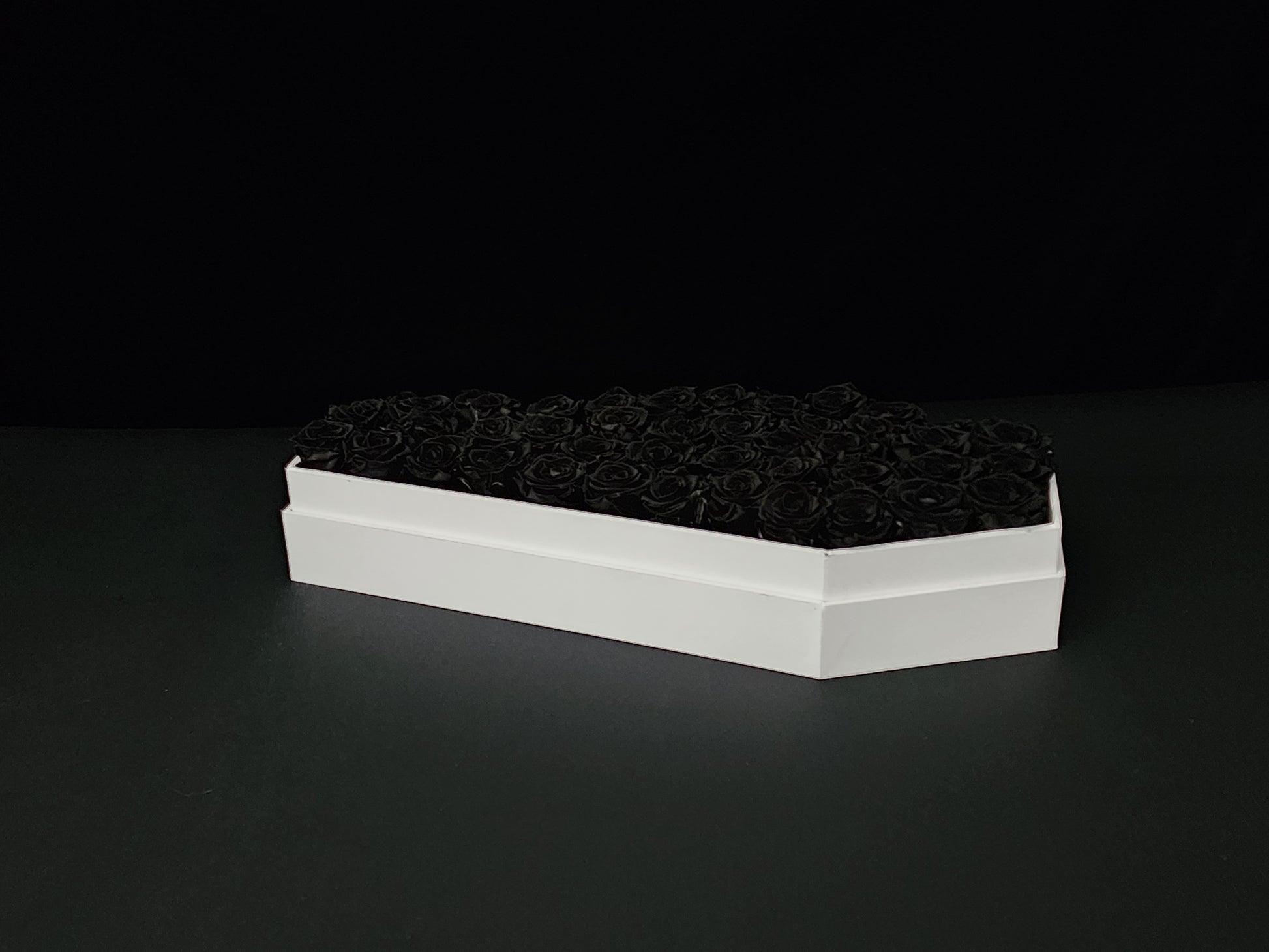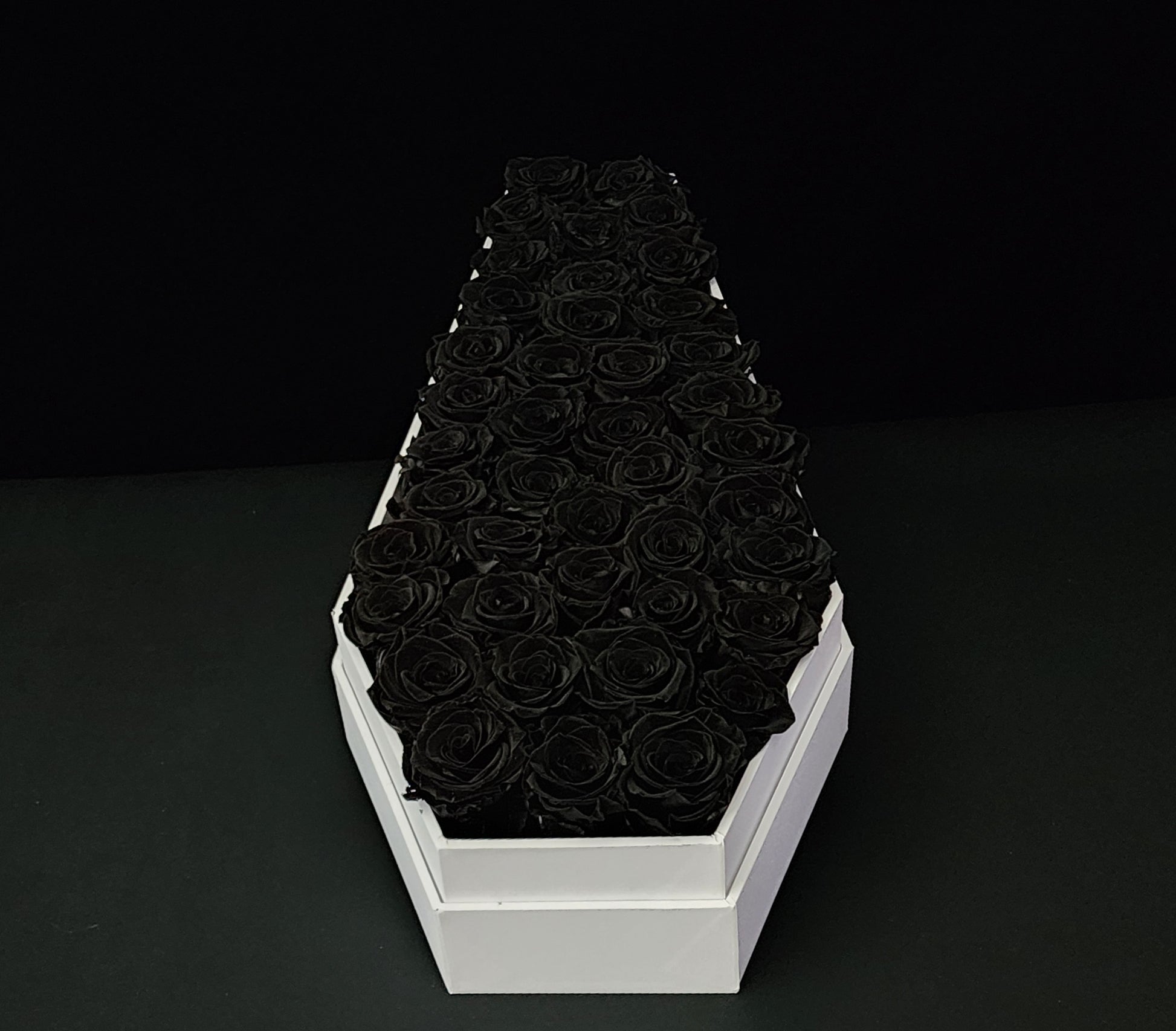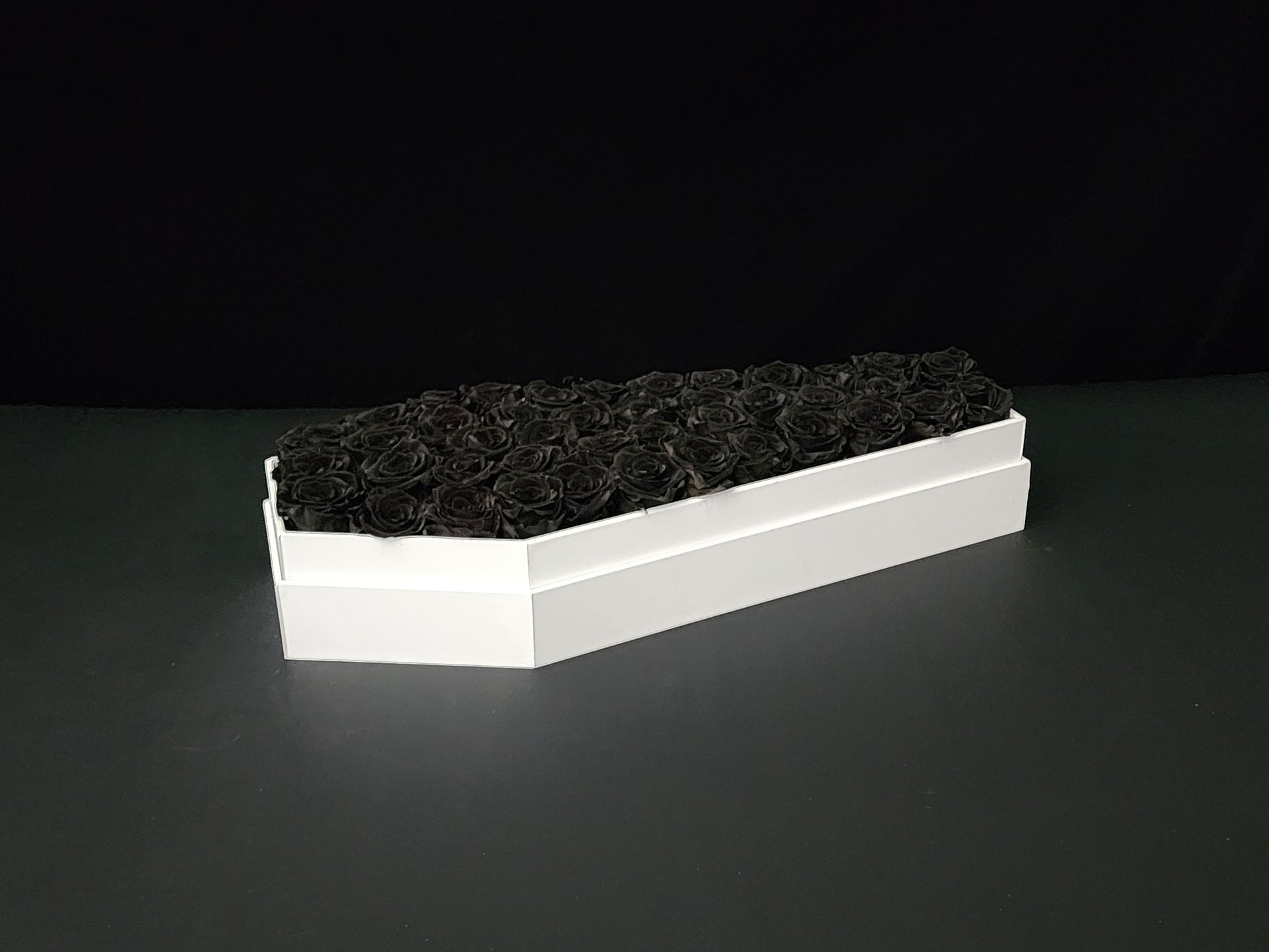 Romance in the shadows. The Phantom Marquee is a striking centerpiece of pure contrast. Meticulously handcrafted in the Ravens Roses Atelier, this massive 21-inch signature white coffin houses an abyss of real, preserved black roses.